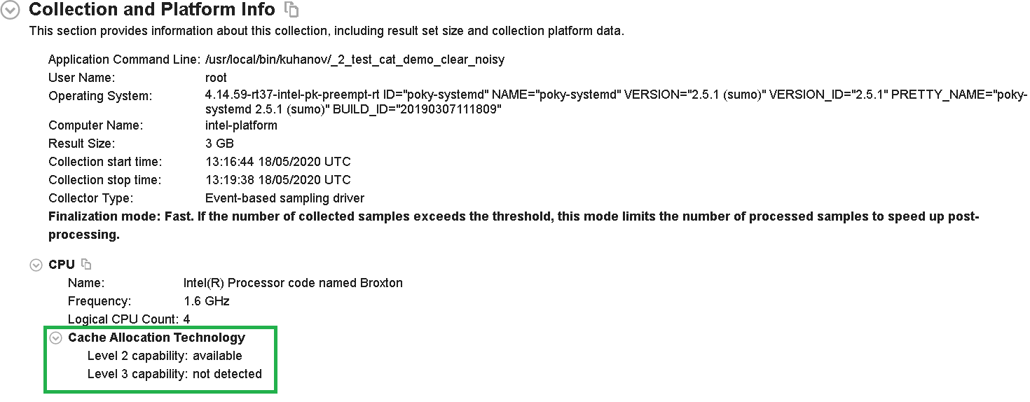 Once Intel® VTune™ Profiler completes the analysis, see the Collection and Platform Info section in the Summary pane. Here, you can see information about CPU support for L2 and L3 Cache Allocation Technology (CAT). In this example, the hardware allows for a split manipulation on LLC (L2 cache).