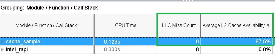 Next, switch to the Bottom-Up pane. Select Module / Function / Call Stack grouping and check the LLC Miss Count value for the cache_sample module.