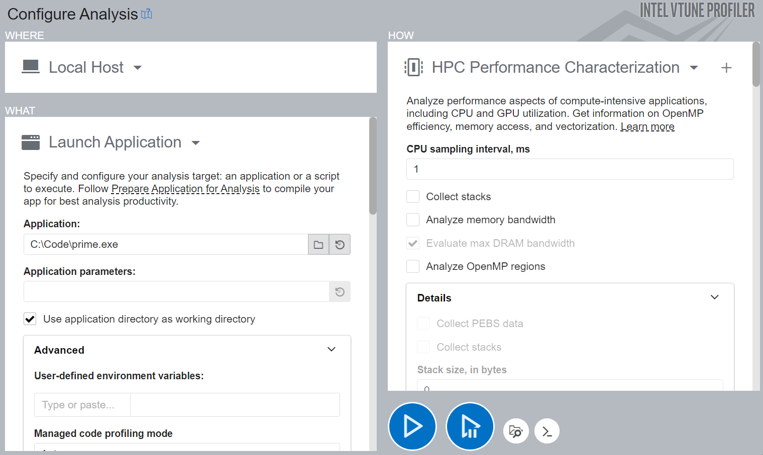 To get a high-level understanding of potential performance bottlenecks for the sample, start with the HPC Performance Characterization analysis: