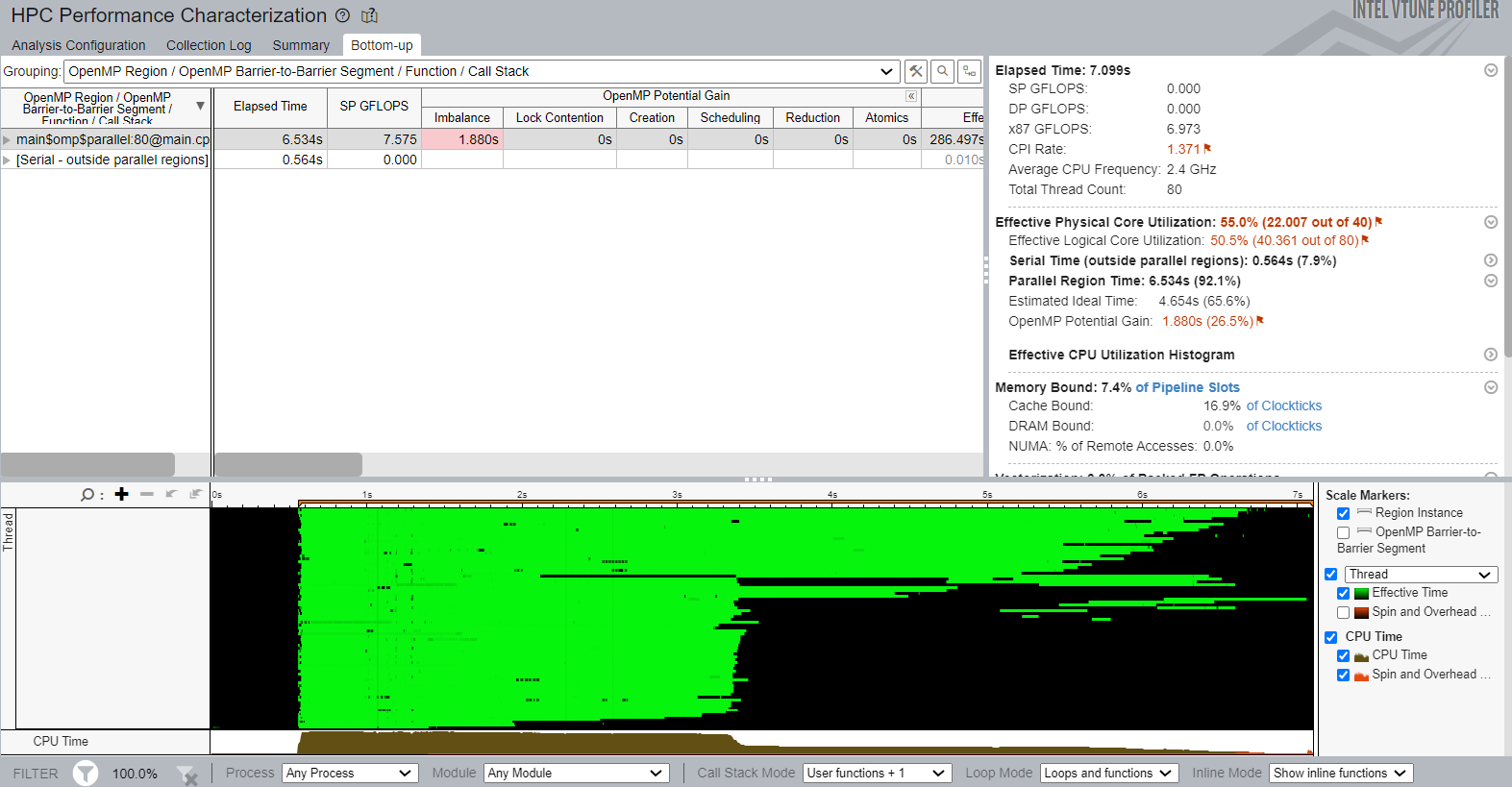 When the HPC Performance Characterization analysis completes, the Summary window shows important HPC metrics that help understand performance bottlenecks like CPU utilization (parallelism), memory access efficiency, and vectorization. For applications that run with the Intel OpenMP runtime, you can benefit from special OpenMP efficiency metrics that help identify issues with threading parallelism.