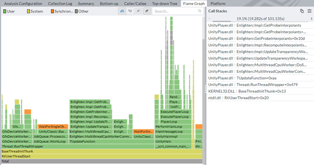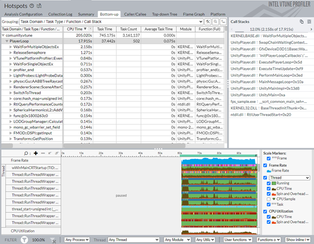 Change the grouping from Function / Call Stack to Task Domain / Task Type / Function / Call Stack to focus on Unity tasks which were identified by the Intel® VTune™ Profiler Instrumentation and Tracing Technology API (ITT API).