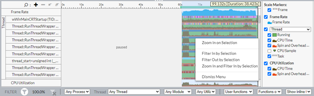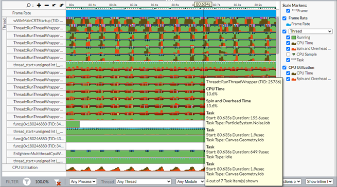In this example, the frame rate is low and there is considerable spin time. In general, a game should not consume a high percentage of the CPU capacity of the system. If the worker threads have low parallelism, they may be adding too much overhead.