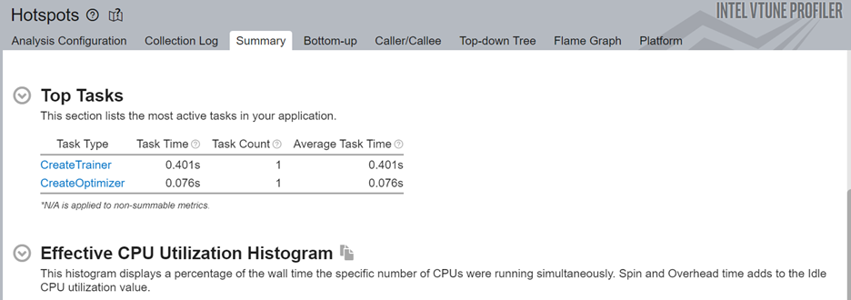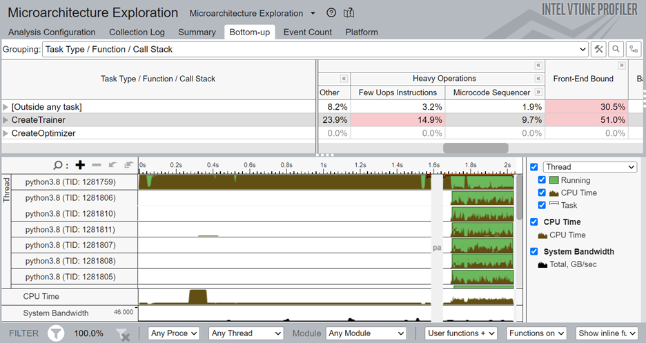 Once the analysis completes, the Bottom-up window displays detailed profiling information for the tasks marked with ITT-Python APIs. We can see that the CreateTrainer task is front-end bound, which means that the front end is not supplying enough operations to the back end. Also, there is a high percentage of heavy-weight operations (those which need more than 2 µops).