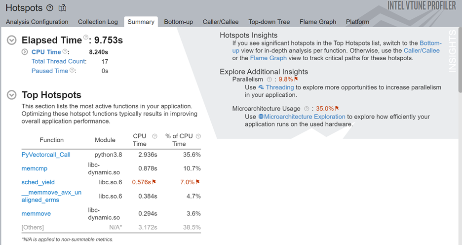 This command uses the -start-paused parameter to profile only those code regions marked by ITT-Python APIs. Let us look at the results of the new Hotspots analysis. The Top Hotspots section displays hotspots in the code regions marked by ITT-Python APIs.