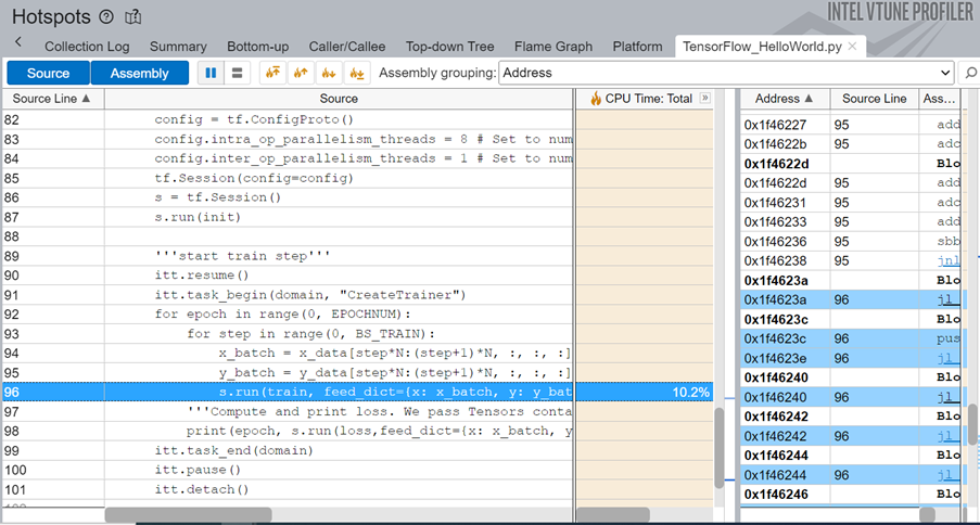 vtune -collect hotspots -start-paused -knob enable-stack-collection=true -knob sampling-mode=sw -search-dir=/usr/bin/python3 -source-search-dir=path_to_src -result-dir vtune_data -- python3 TensorFlow_HelloWorld.py