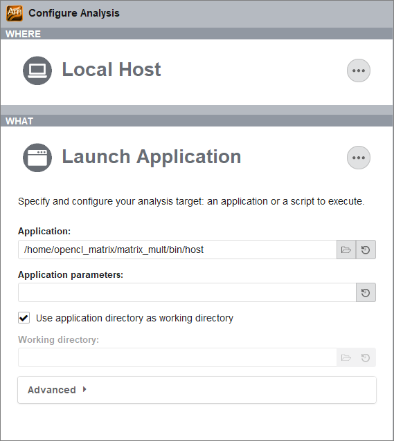 Configure Analysis window showing matrix multiply file path