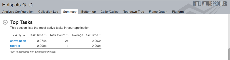 While you can dig deeper by switching to the Bottom-up window, it may be challenging to isolate the most interesting regions for optimization. This is particularly true for larger applications because there may be a lot of model operators and functions in every layer of the code. Therefore, we will now add Intel® Instrumentation and Tracing Technology (ITT) APIs to generate results that are easier to interpret.