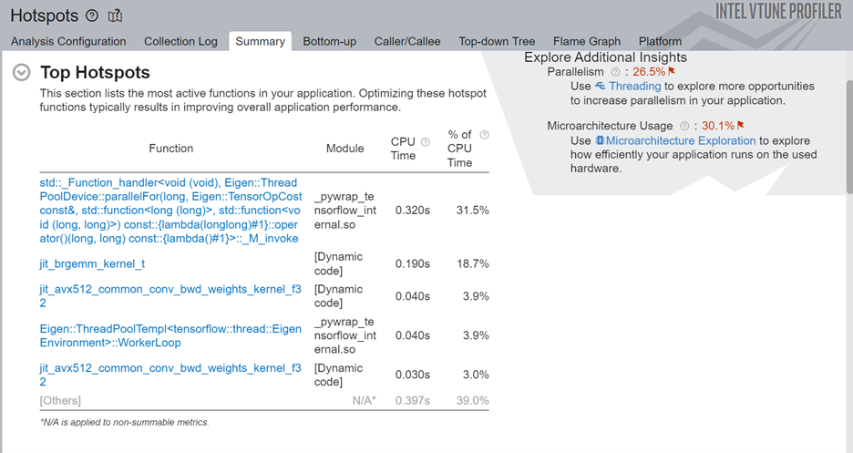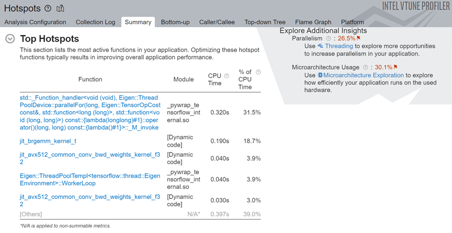 However, understanding computational and memory bottlenecks in DL code like Python or C++ is challenging and often requires significant effort due to the presence of hierarchical layers and non-linear functions. Frameworks like Tensorflow* and PyTorch* provide native tools and APIs that enable the collection and analysis of performance metrics during different stages of Deep Learning Model development. But the scope of these profiling APIs and tools is quite limited. They do not provide deep insight at the hardware level to help you optimize different operators and functions in the Deep Learning models.