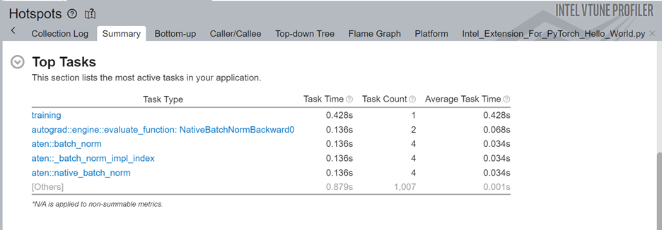 Let us start by running a Hotspots analysis on the Intel_Extension_For_PyTorch_Hello_World.py ML application, without any change to the code. This analysis is a good starting point to identify the most time-consuming regions in the code.