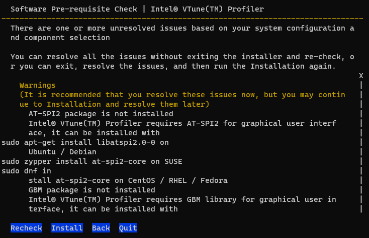 - Install Intel® VTune™ Profiler as root or administrator with default configurations. If you install on a Linux OS, you may encounter warnings about missing GUI libraries. You can ignore these warnings as the libraries are not required to run the web server.