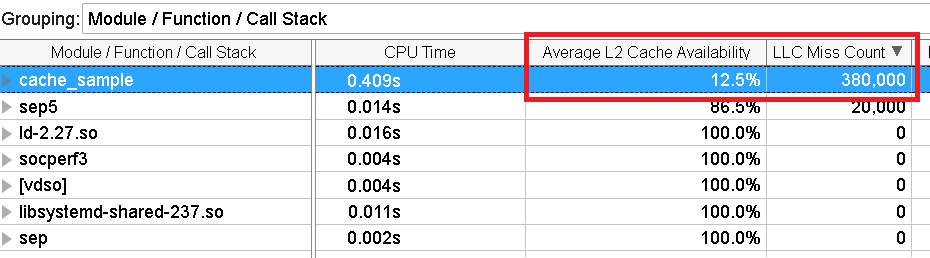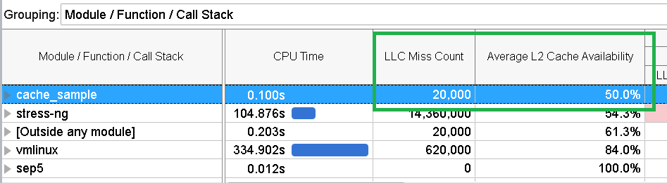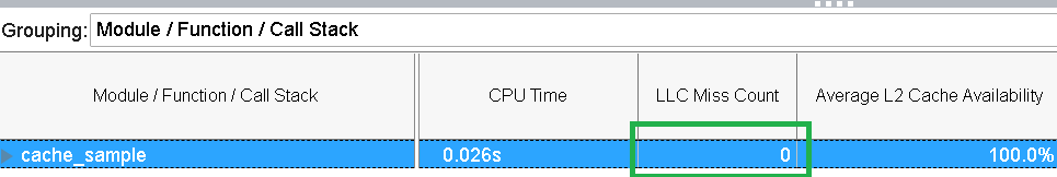 Next, switch to the Bottom-Up pane. Select Module / Function / Call Stack grouping and check the LLC Miss Count value for the cache_sample module.