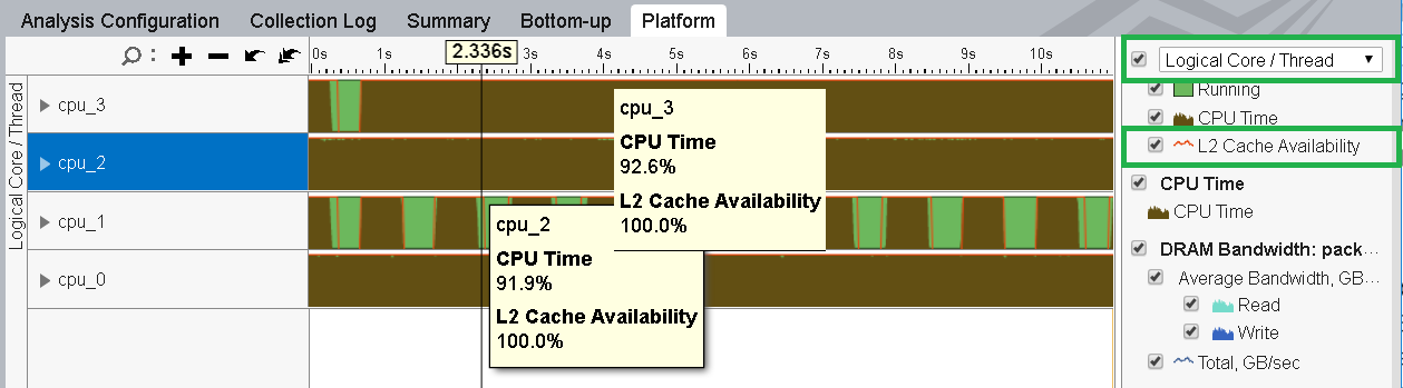 Now, open the Platform pane. Group results by Logical Core/Thread and select the L2 Cache Availability checkbox.