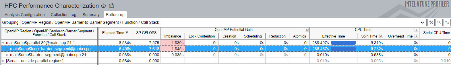 In this sample, there is a loop barrier with critical imbalance and a parallel region join barrier that is not classified by VTune Profiler as a bottleneck.
