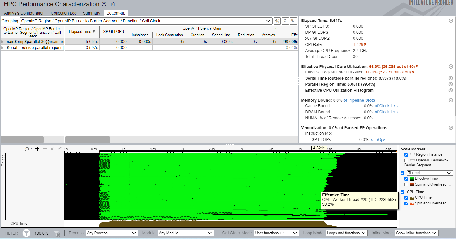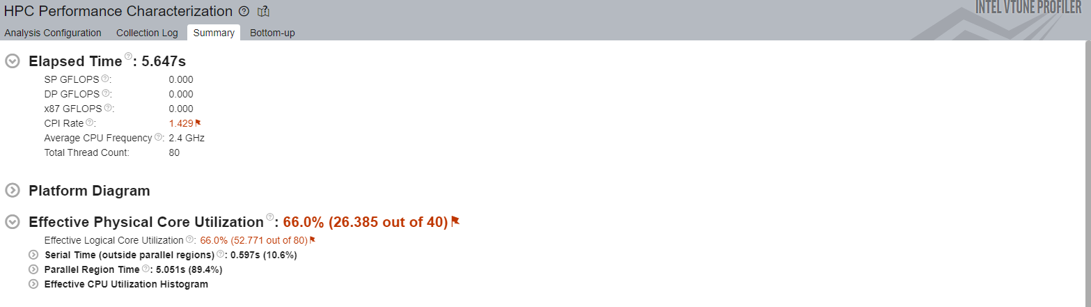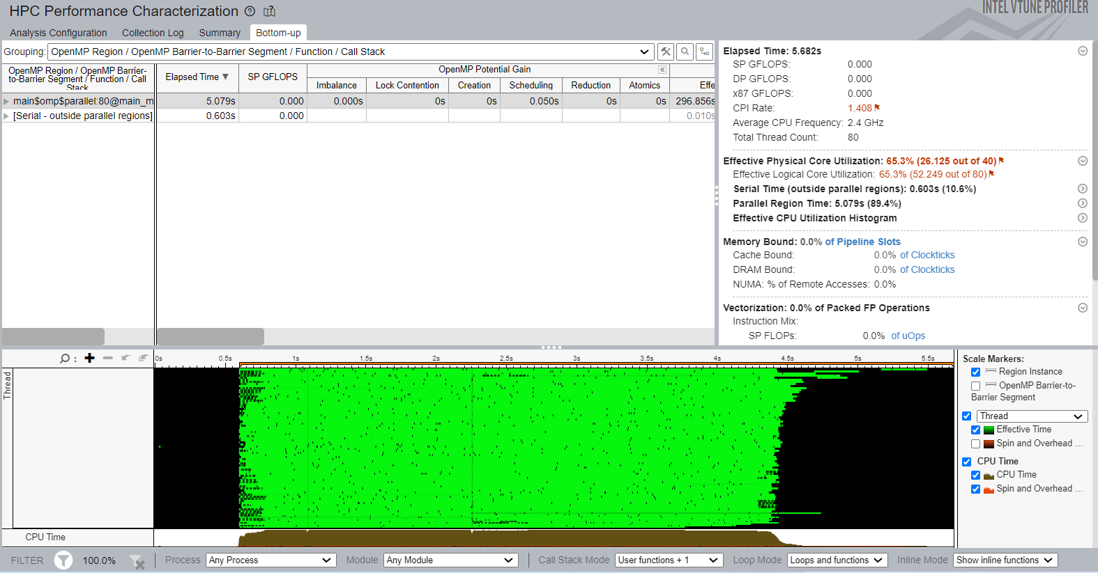 When the HPC Performance Characterization analysis completes, the Summary window shows important HPC metrics that help understand performance bottlenecks like CPU utilization (parallelism), memory access efficiency, and vectorization. For applications that run with the Intel OpenMP runtime, you can benefit from special OpenMP efficiency metrics that help identify issues with threading parallelism.