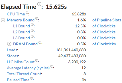 In spite of the expected high DRAM utilization for the PMDK code, the summary metrics do not define this sample app as DRAM bandwidth bound: