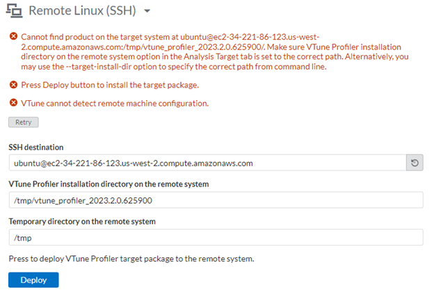 Intel® VTune™ Profiler attempts to connect to the remote system to determine if the binaries necessary for data collection have been installed.