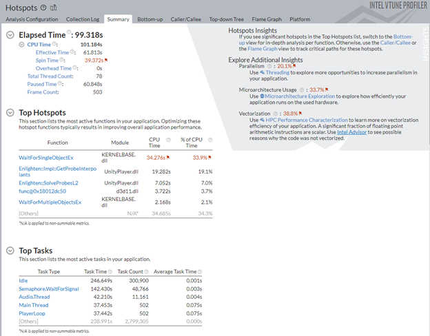 After the data collection runs for about 30 seconds, click Stop to exit the game and finalize the VTune results. This process may take a few minutes as Intel® VTune™ Profiler finds and resolves debug symbols.