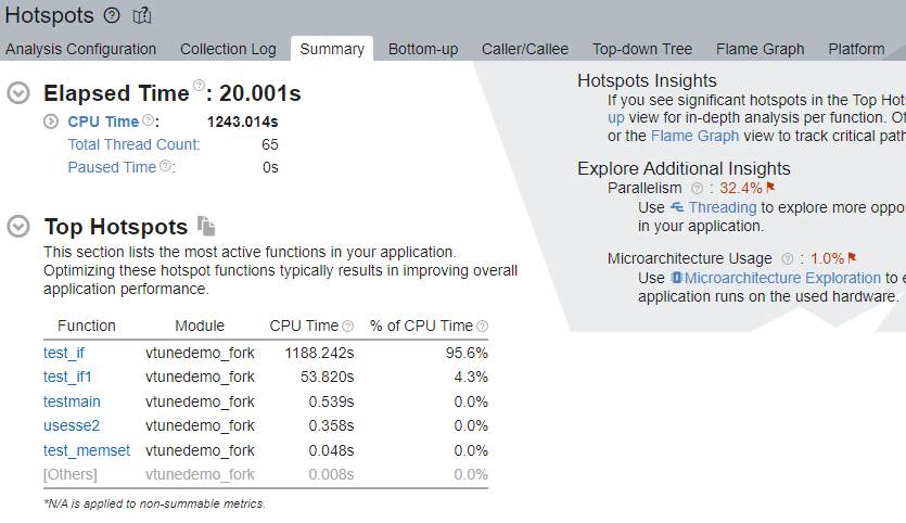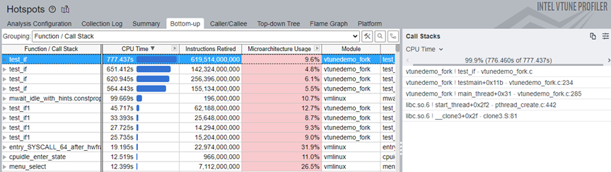 In the Top Hotspots section, we see that the test_if function of the target application consumed the most CPU time. Click on this function and switch to the Bottom-up window. See the stack flow for this hotspot.