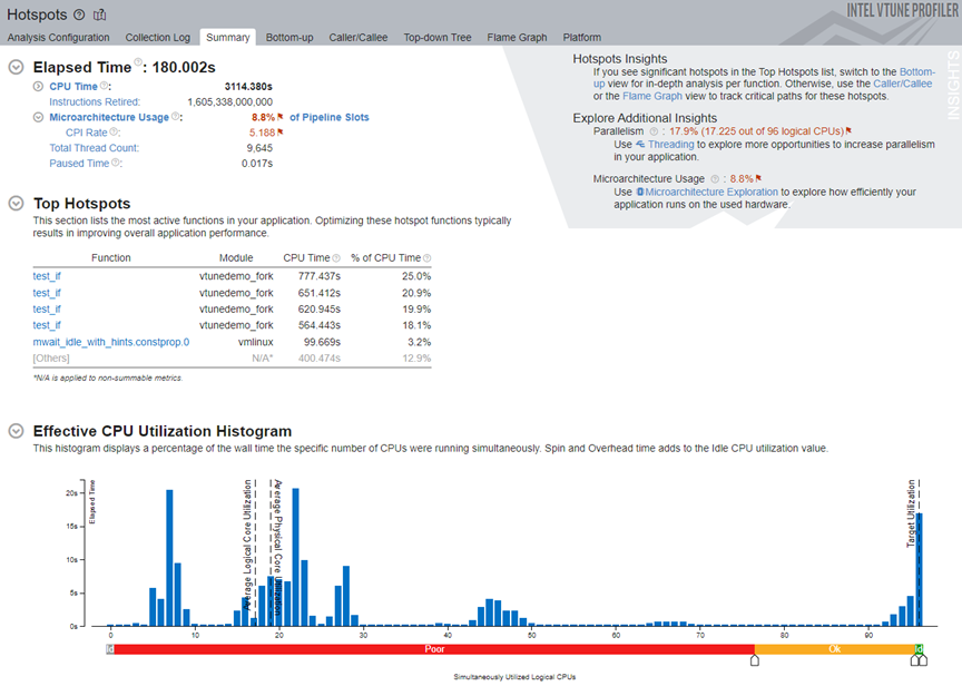Once the analysis completes, VTune Profiler displays results in the Summary window.