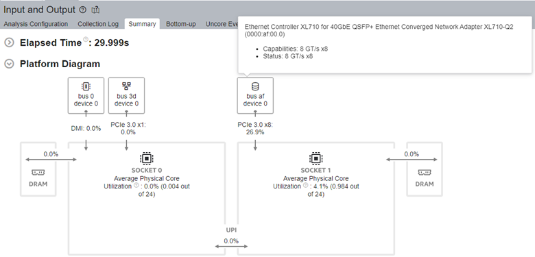 In the Summary tab, see the PCIe Traffic Summary section. You see the total inbound and outbound PCIe read and write traffic as first-level metrics. Intel DDIO utilization efficiency indicators appear as second-level metrics: