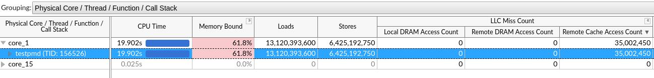 To understand typical inefficient usages of Intel DDIO technology and the capabilities of VTune Profiler that help to highlight them, run the DPDK testpmd application on a two-socket system equipped with 2nd Generation Intel® Xeon® Scalable processors. The application is configured to run on a single core and to perform packet forwarding using one port of a single 40G NIC attached to Socket 1.