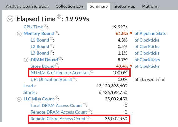 From the VTune Profiler results, we see in the remote configuration that CPU cores suffer from remote accesses. These are due to LLC misses that get resolved by taking the data from the remote L3 cache.