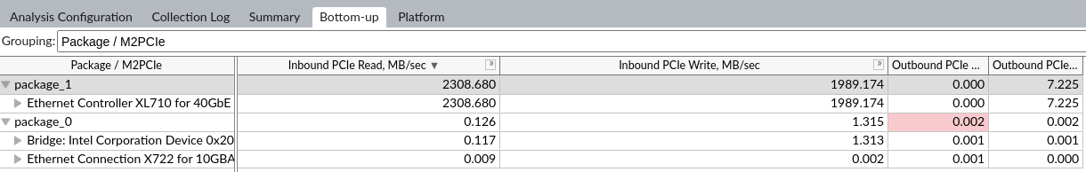 To see PCIe metrics, select the Package/M2PCIe grouping in the Grouping drop-down menu. This grouping breaks down the metrics by sockets. The M2PCIe blocks are named by the PCIe devices they serve. If M2PCIe manages more than one device, the device names are display in a comma-separated list. Hover over a cell to see all devices.