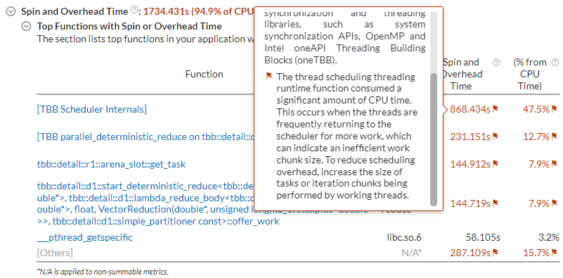 This row points to the parallel_deterministic_reduce construct in the VectorReduction function that has the highest scheduling overhead. Try to make work chunks more coarse-grain to eliminate the overhead in parallelization with this construct.