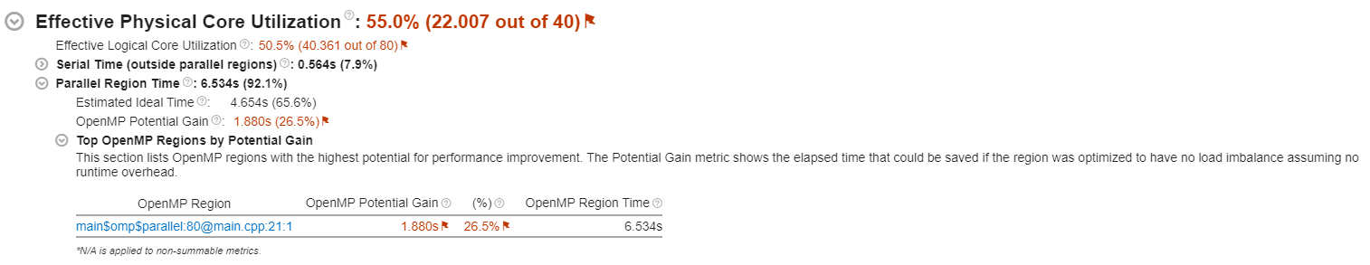 In the Parallel Region Time section, see the OpenMP Potential Gain metric. Use this to estimate the maximum potential gain that you can get by eliminating parallel inefficiencies. In the sample application, the potential gain is 1.880s (equal to 26.5% of the application runtime). This metric is flagged in the example, so it may be worthwhile to explore the breakdown by parallel constructs.