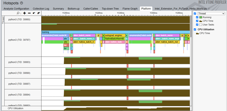 Switch to the Platform window to see the timeline for the training task, which was marked using PyTorch* ITT APIs.
