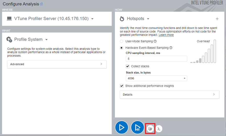 host> cd /opt/intel/oneapi/vtune/latest host> source vtune-vars.sh host> vtune-backend --allow-remote-access --web-port=50777 --enable-server-profiling &