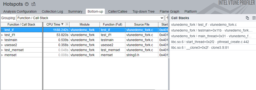 In the Top Hotspots section, we see that the test_if function of the target application consumed the most CPU time. Click on this function and switch to the Bottom-up window. See the stack flow for this hotspot.