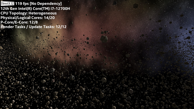 As an additional exercise, force the render tasks to run on P-Cores and update tasks to run on E-Cores. To do this, enable the ENABLE_RUNON macro in HybridDetect.h. See how this change affects performance.