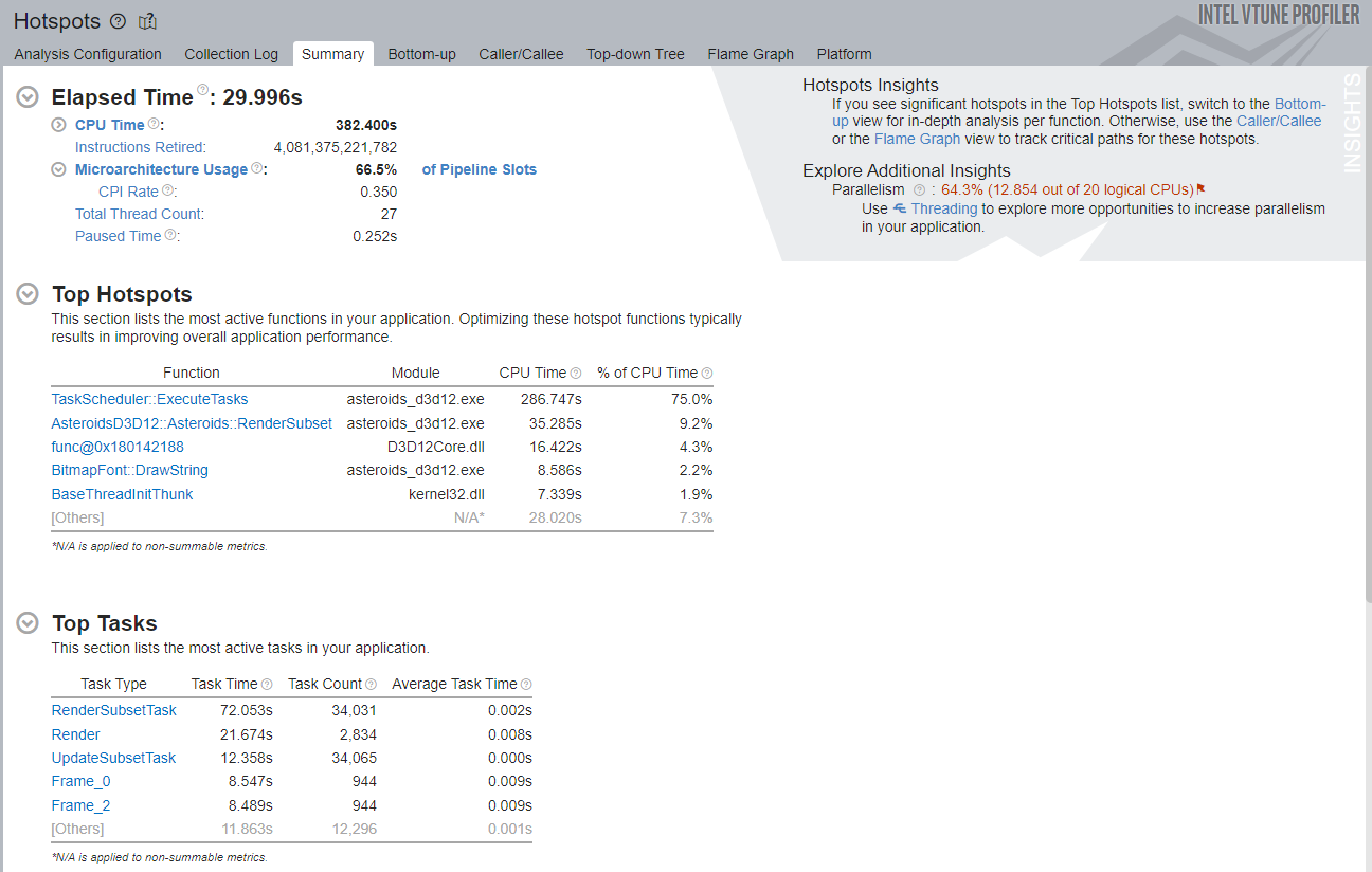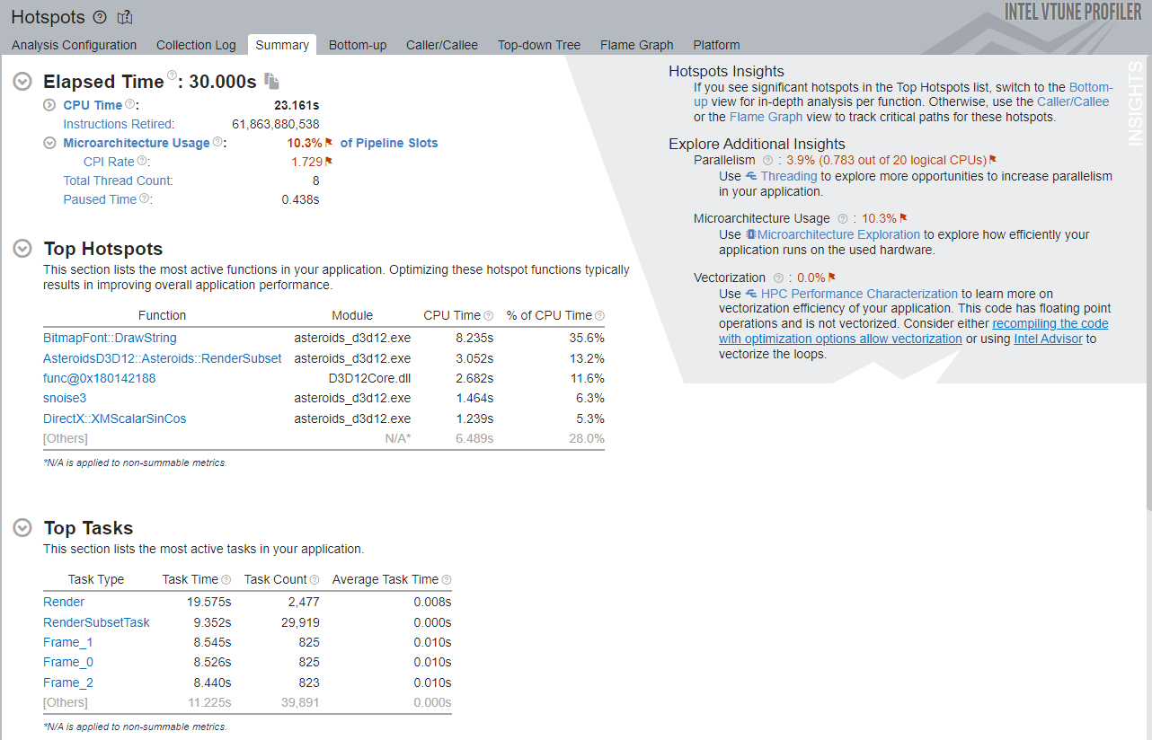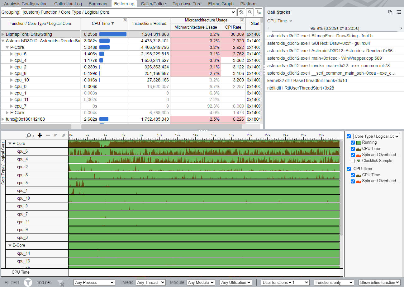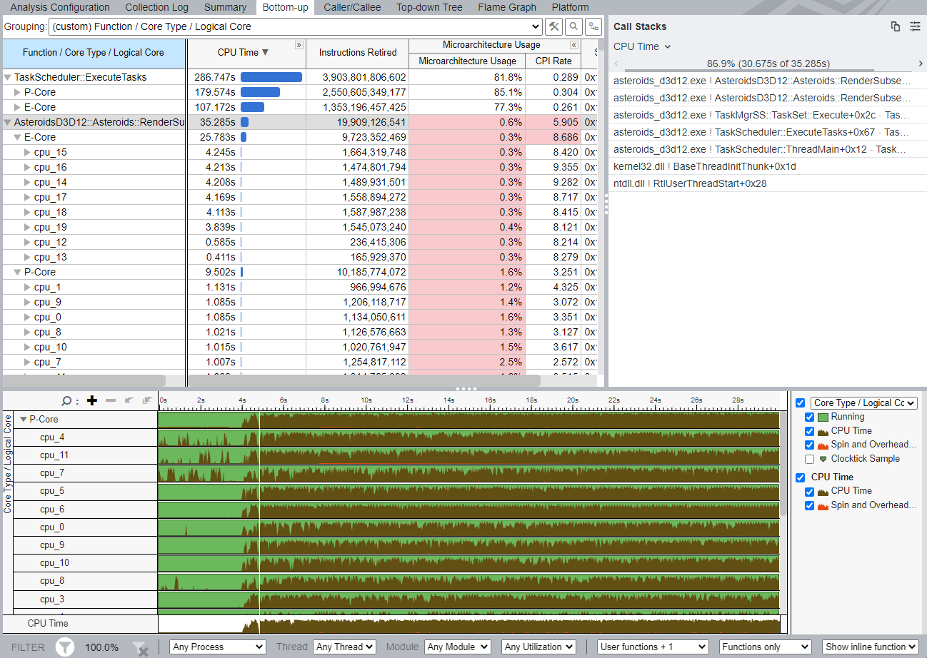This recipe describes how you use VTune Profiler to profile and visualize performance data for Windows* applications that run on hybrid CPUs. This recipe highlights two examples with the asteroids_d3d12 executable in the HybridDetect sample. For a description of this sample, see the Game Dev Guide for 12th Gen Intel® Core™ Processor.