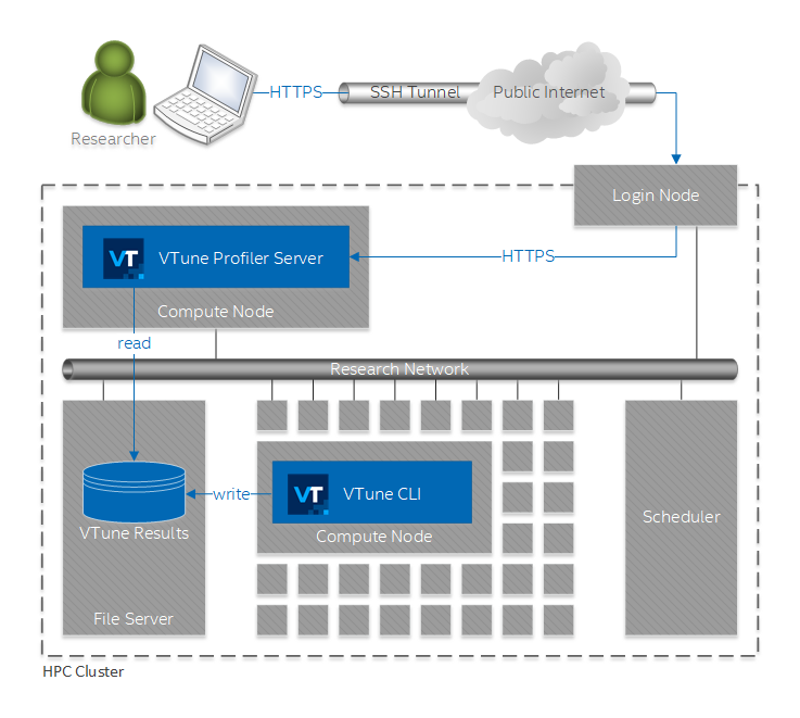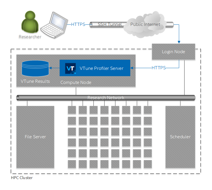 In this scenario, you run VTune Profiler server on a compute node inside an HPC cluster and access the VTune Profiler GUI via a web browser on your laptop. This usage model is somewhat similar to using VTune Profiler desktop GUI via VNC, but it is easier to set up and provides a better user experience.
