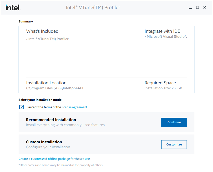 • In the Recommended Installation mode, VTune Profiler installs in the default directory and integrates into your Microsoft Visual Studio* IDE.