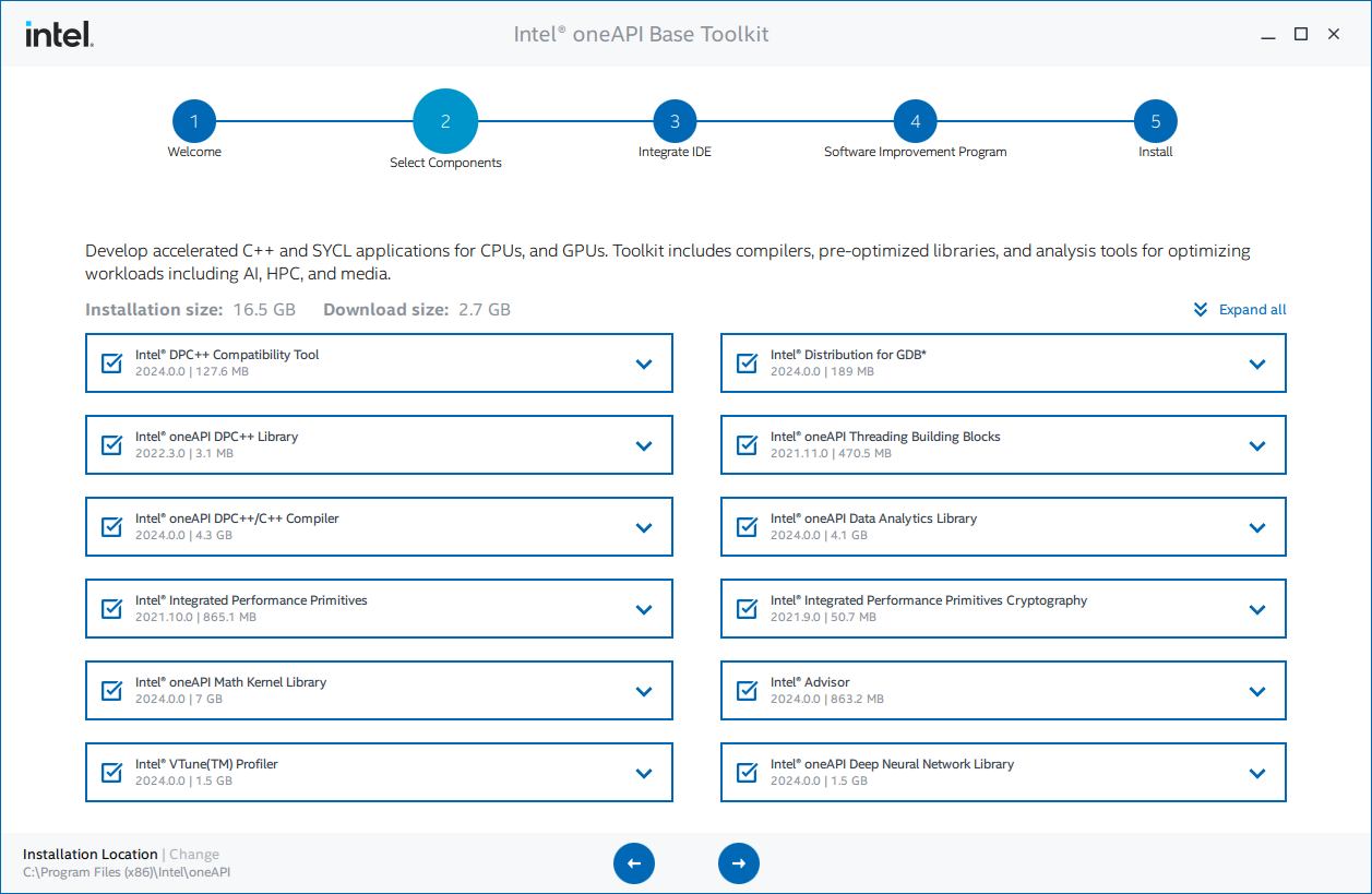 • Install directory: Specify a custom install directory. The default location is <Program Files (x86)>\Intel\oneAPI\