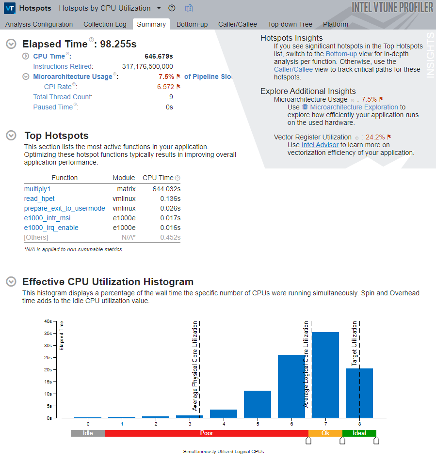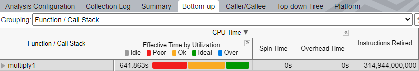 The Top Hotspots section of the Summary window provides data on the most time-consuming functions (hotspot functions) sorted by CPU time spent on their execution. For the sample application, the multiply1 function, which took roughly 640 seconds to execute, shows up at the top of the list as the hottest function.