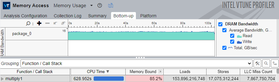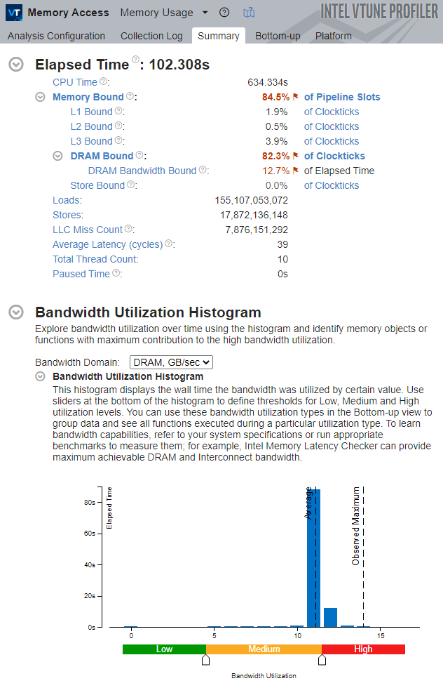 Once again, note that the application is severely bound by memory accesses. The fact that the system is not bound by the DRAM Bandwidth alone indicates that the application is bound by frequent, but small, requests to memory, rather than by the saturated physical DRAM Bandwidth.
