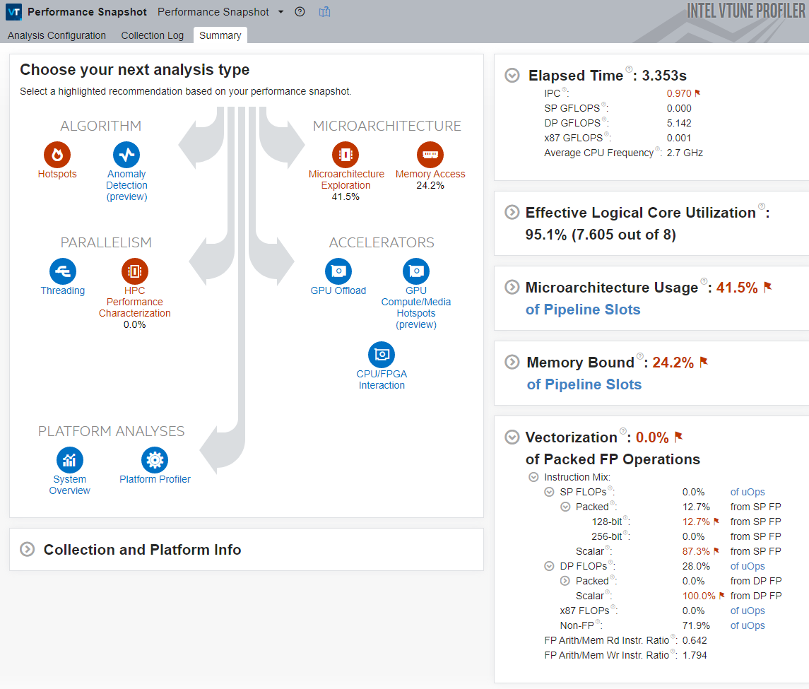 The Vectorization metric is equal to 0.0%, which means that the code was not vectorized. Due to this, Performance Snapshot highlights the HPC Performance Characterization analysis as a potential next step.