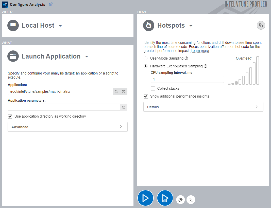For the collection mode, you can choose between User-Mode Sampling and Hardware Event-Based Sampling. These sampling methods are different, but, typically, it is better to use Hardware Event-Based Sampling when possible, since it provides greater detail with lower overhead.