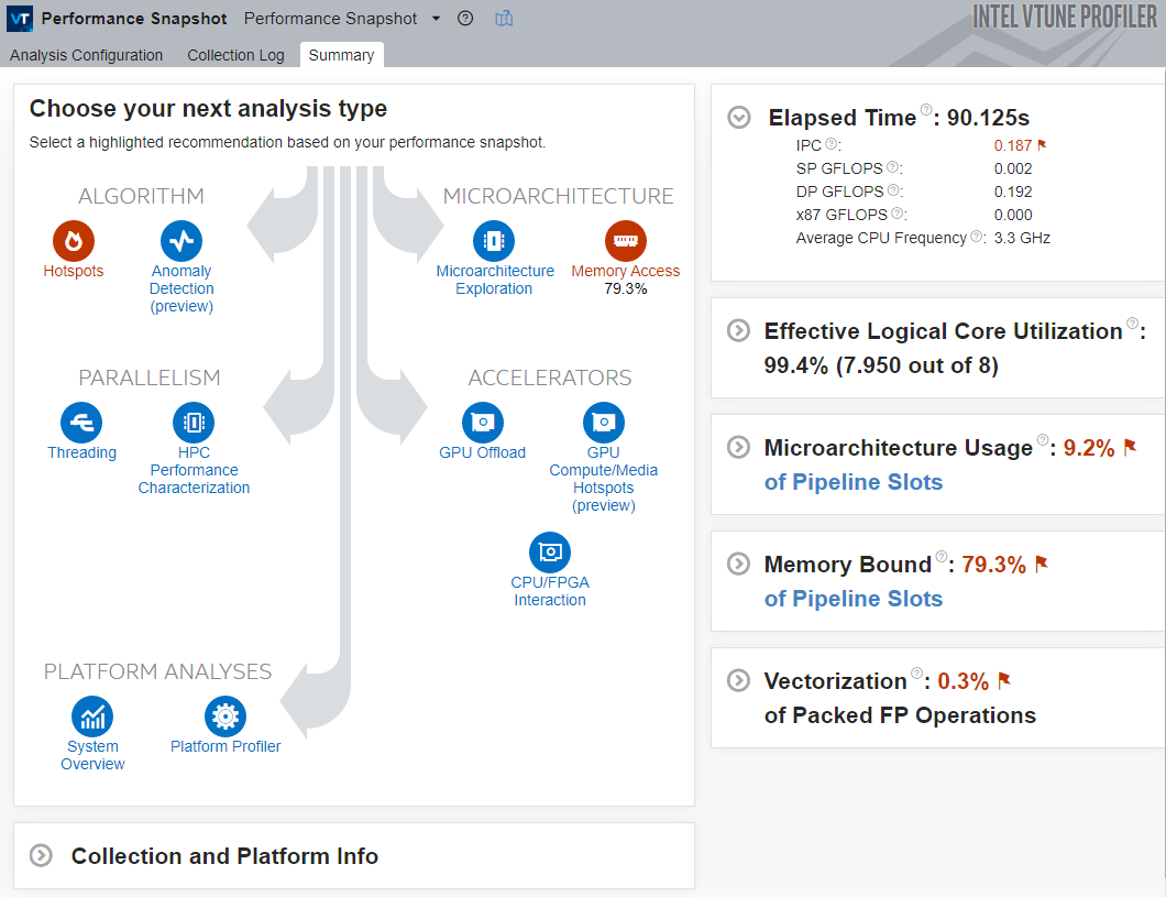 - Collection and Platform Info: this pane shows the information about the system on which this particular result was collected. It is useful when opening results collected on a different hardware platform.