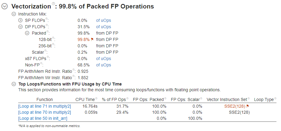 Note that the main loop of the multiply2 function was vectorized using the older SSE2 instruction set, while compilation and analysis were performed on an AVX2-capable processor. Therefore, a portion of hardware resources remains underutilized.