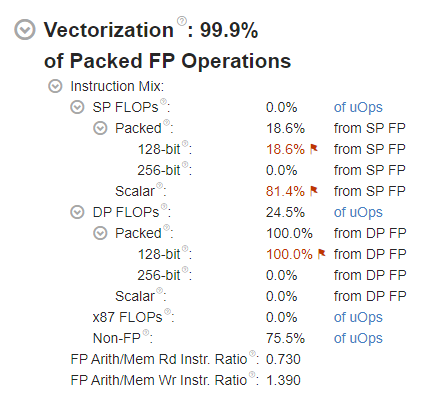 However, there are red flags next to the 128-bit Packed FLOPs metrics. Hover over the red flag icon or the metric value to get a description of the issue.