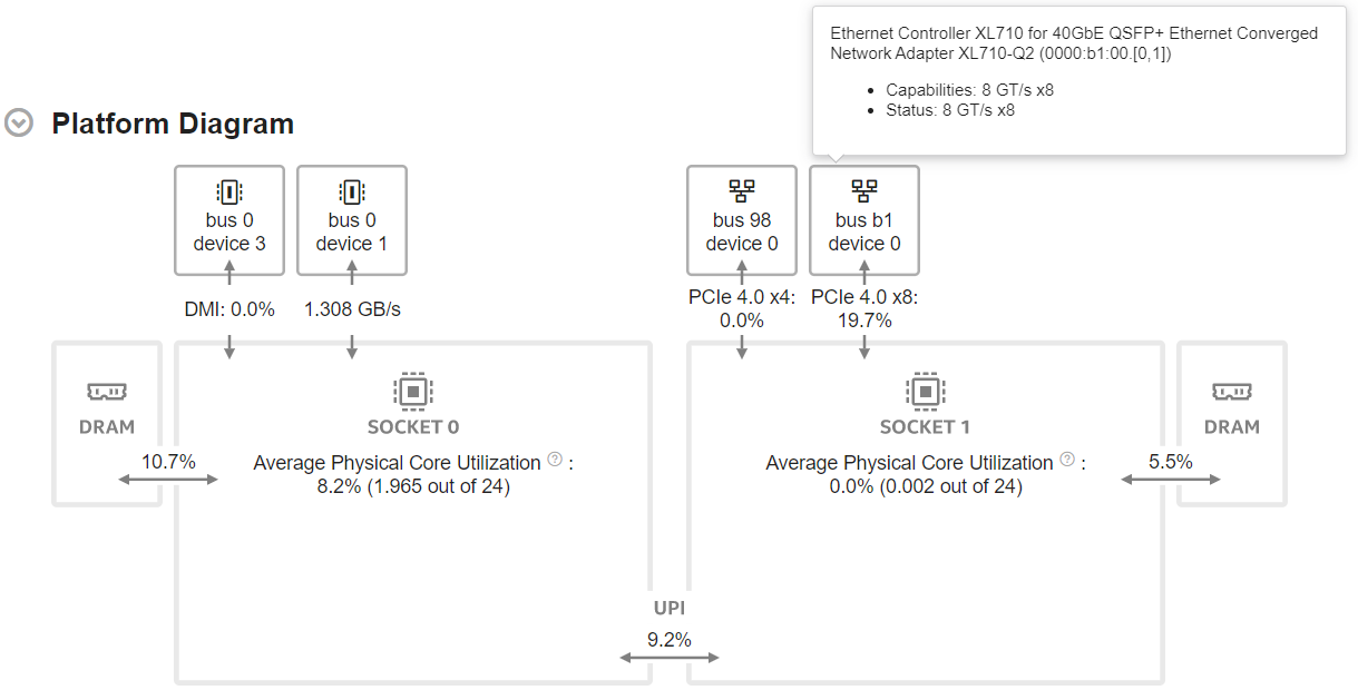 The Average UPI Utilization metric reveals UPI utilization in terms of transmit. The Platform Diagram shows a single cross-socket connection, regardless of how many UPI links connect a pair of packages. If there is more than one link, the maximum value is shown.