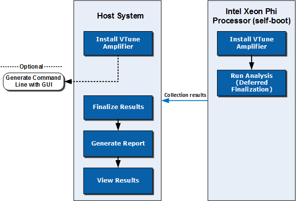 The workflow represented in the diagram is the recommended flow to speed up the analysis process. It is possible to run the full Intel VTune Profiler collection on the Intel Xeon Phi processor, but finalization and visualization might be slow. You can follow the regular analysis flow directly on the target Intel Xeon Phi processor.