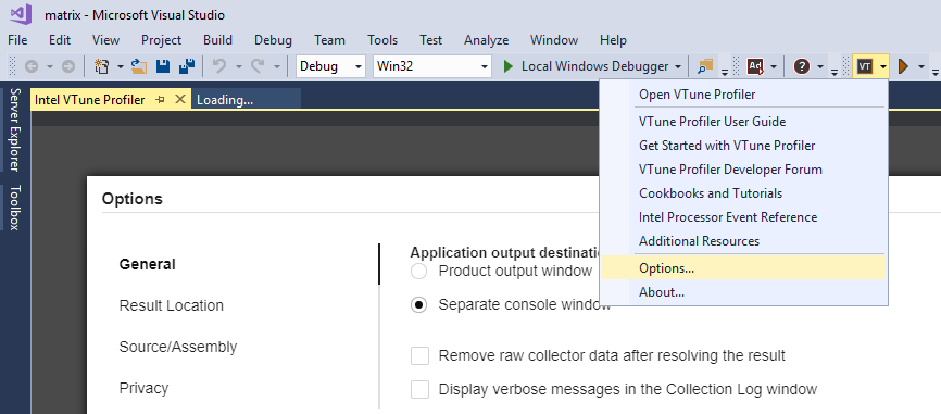 menu button and select Options... > Intel VTune Profilerversion > Result Location.