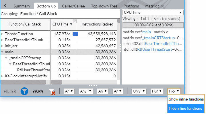 Configure the Intel® VTune™ Profiler data view to display the performance data per inline functions for applications in the Release configuration.