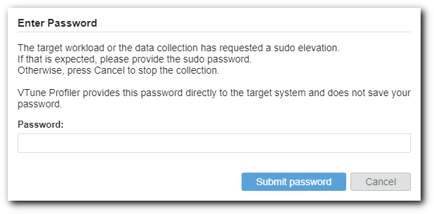 If the target workload or the collector request a sudo elevation during the analysis, VTune Profiler Server requests this password interactively in the Web Interface: