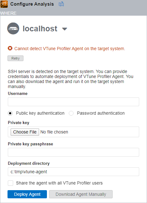 VTune Profiler Server uses SSH for automated agent deployment. Running an SSH server on the target machine is required for automated deployment.